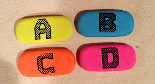The erasers came in a four pack. Each package features four different erasers, each a different color. Each eraser also has a letter on it; A, B, C, or D. As soon as I saw these beauties, my mind began searching for a way I could incorporate these into instruction.
